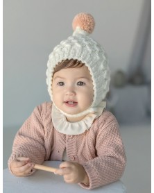 Adorable knitted bonnet with little pompom and side button to close it.
