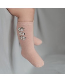 Adorable pink knee high socks with non slip soles in soft cotton and cute three flowers on each side.
