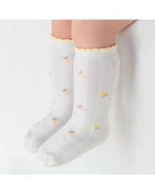 Adorable white knee high socks with non slip soles in soft cotton and cute flower pattern.
