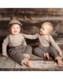 Adjustable stripes with a wooden button, pleated detail on the back and snap fasteners at the crotch for easy slip on.