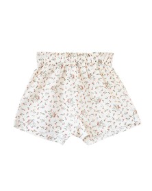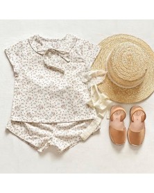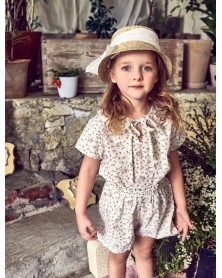 Adorable girl set in lovely white and pink floral fabric. It includes a pretty blouse with Peter Pan collar and a shortie in the same fabric.